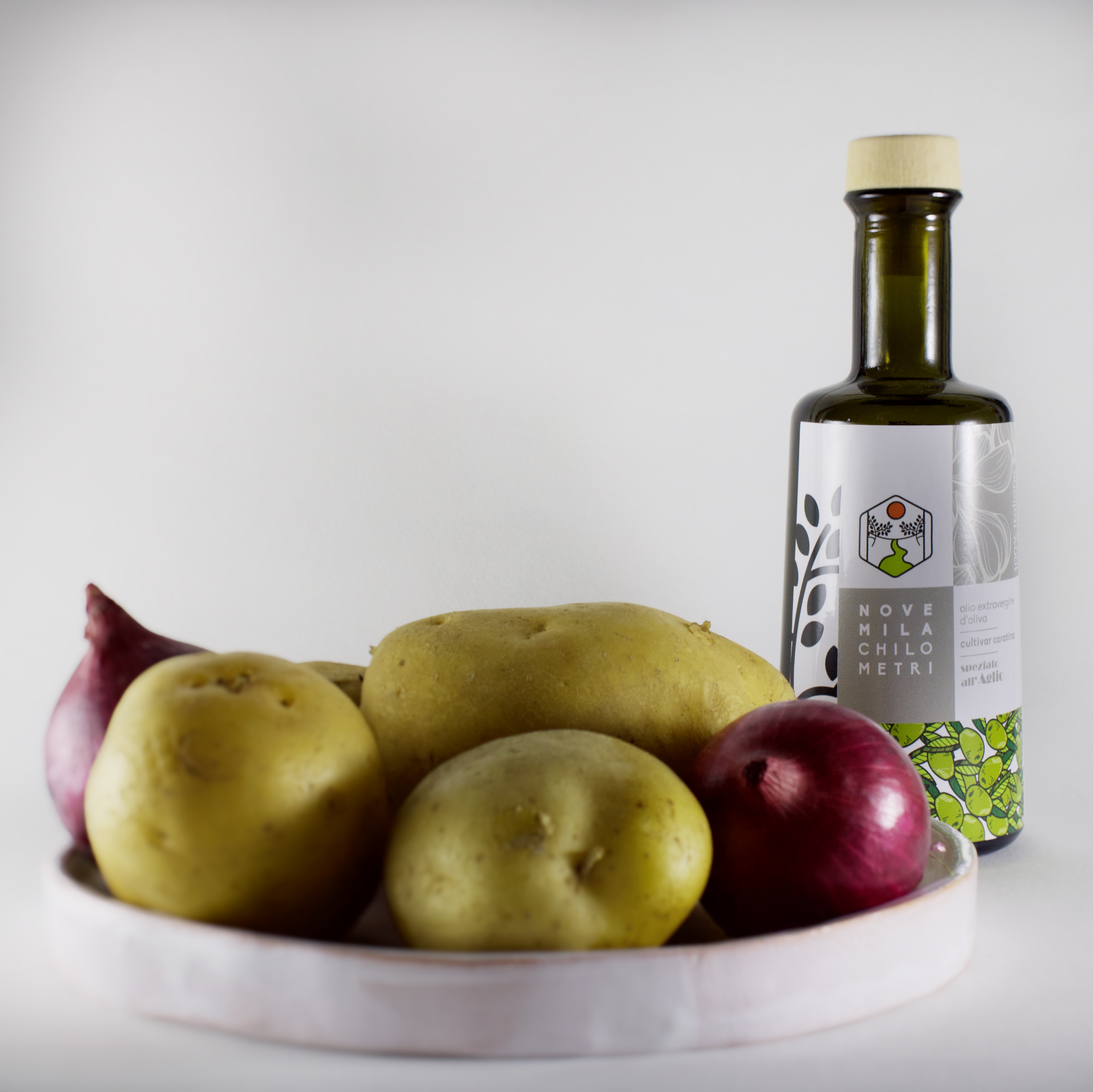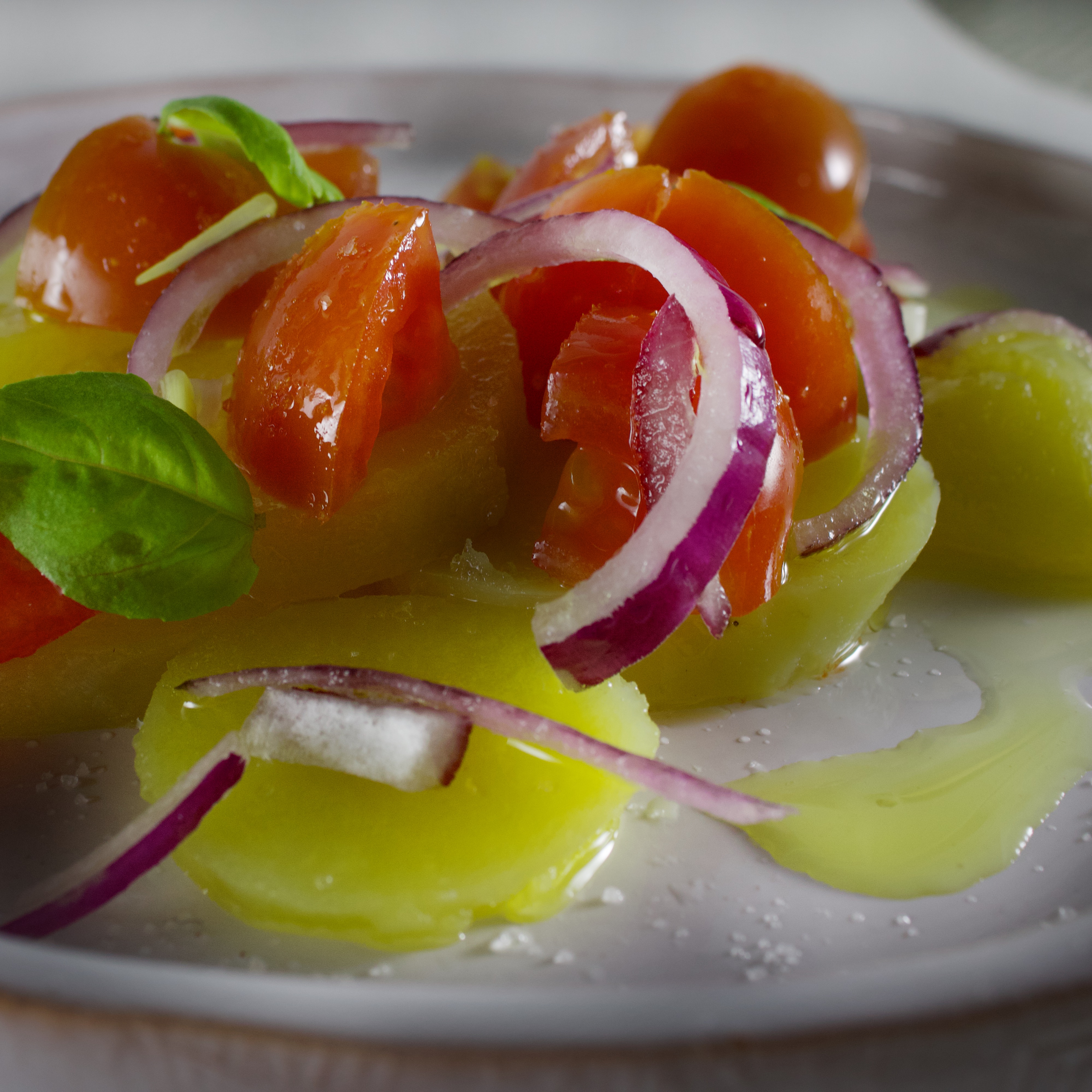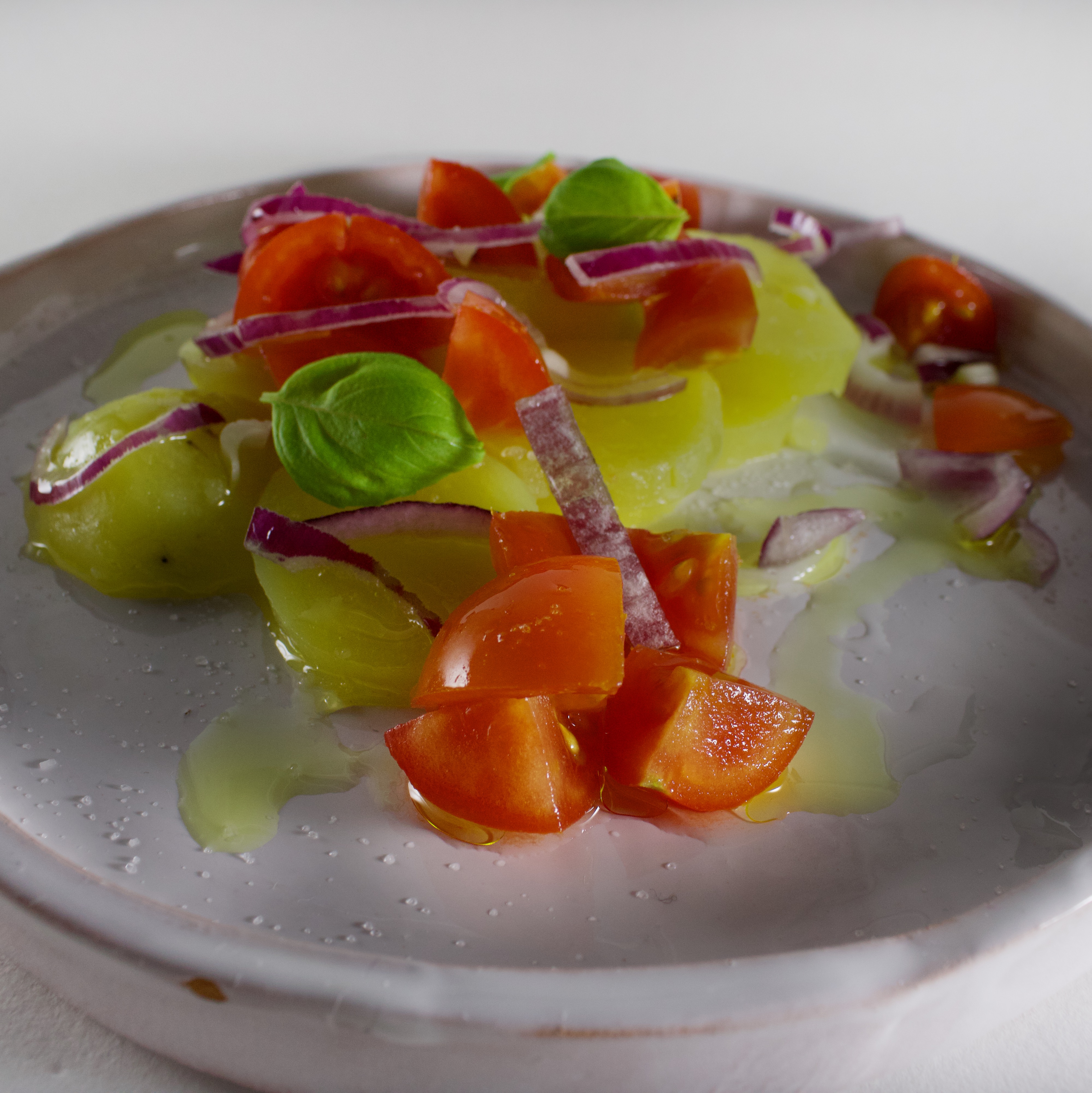 Un contorno veloce, fresco e gustoso: insaltata di patate con olio evo aromatizzato all'aglio.