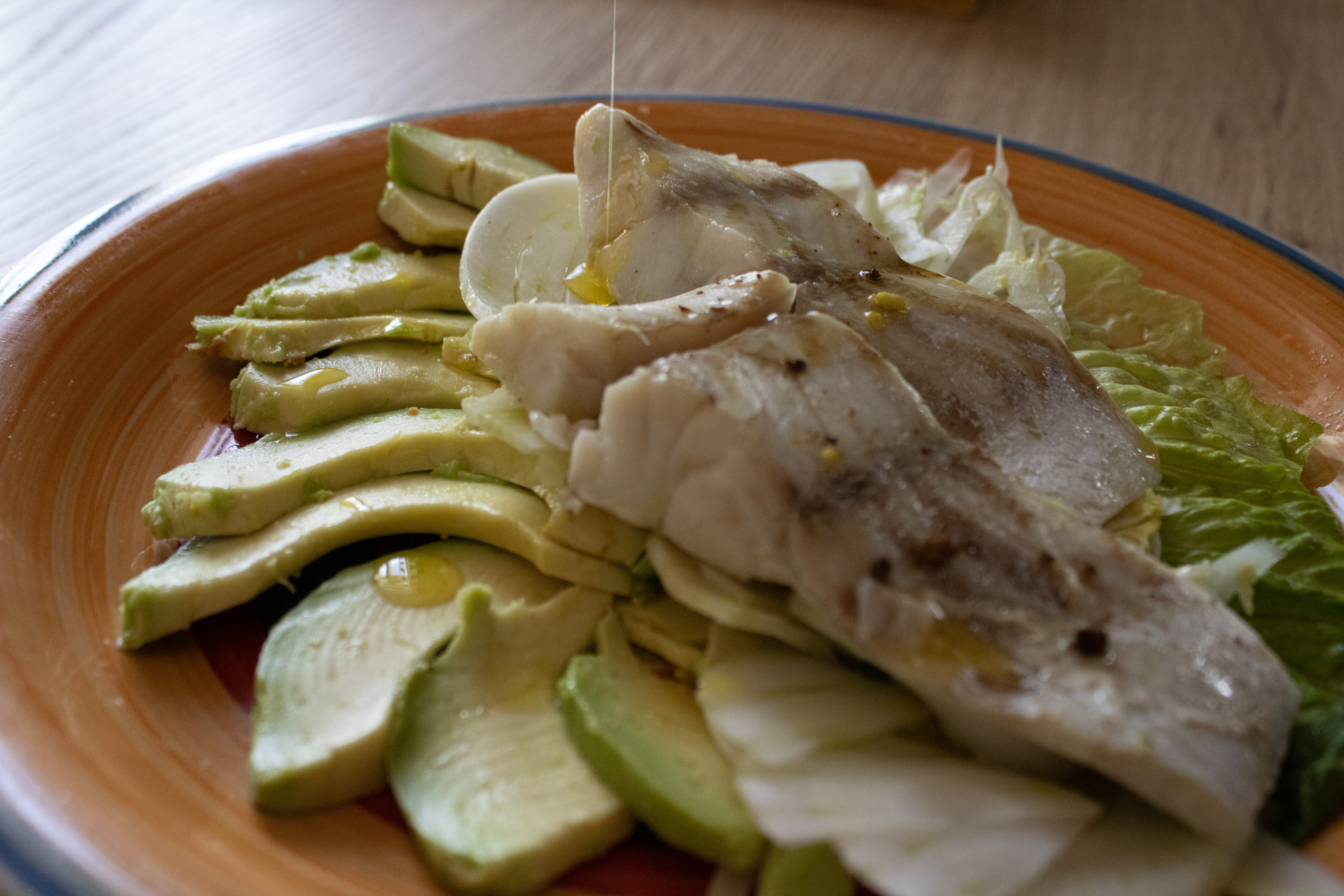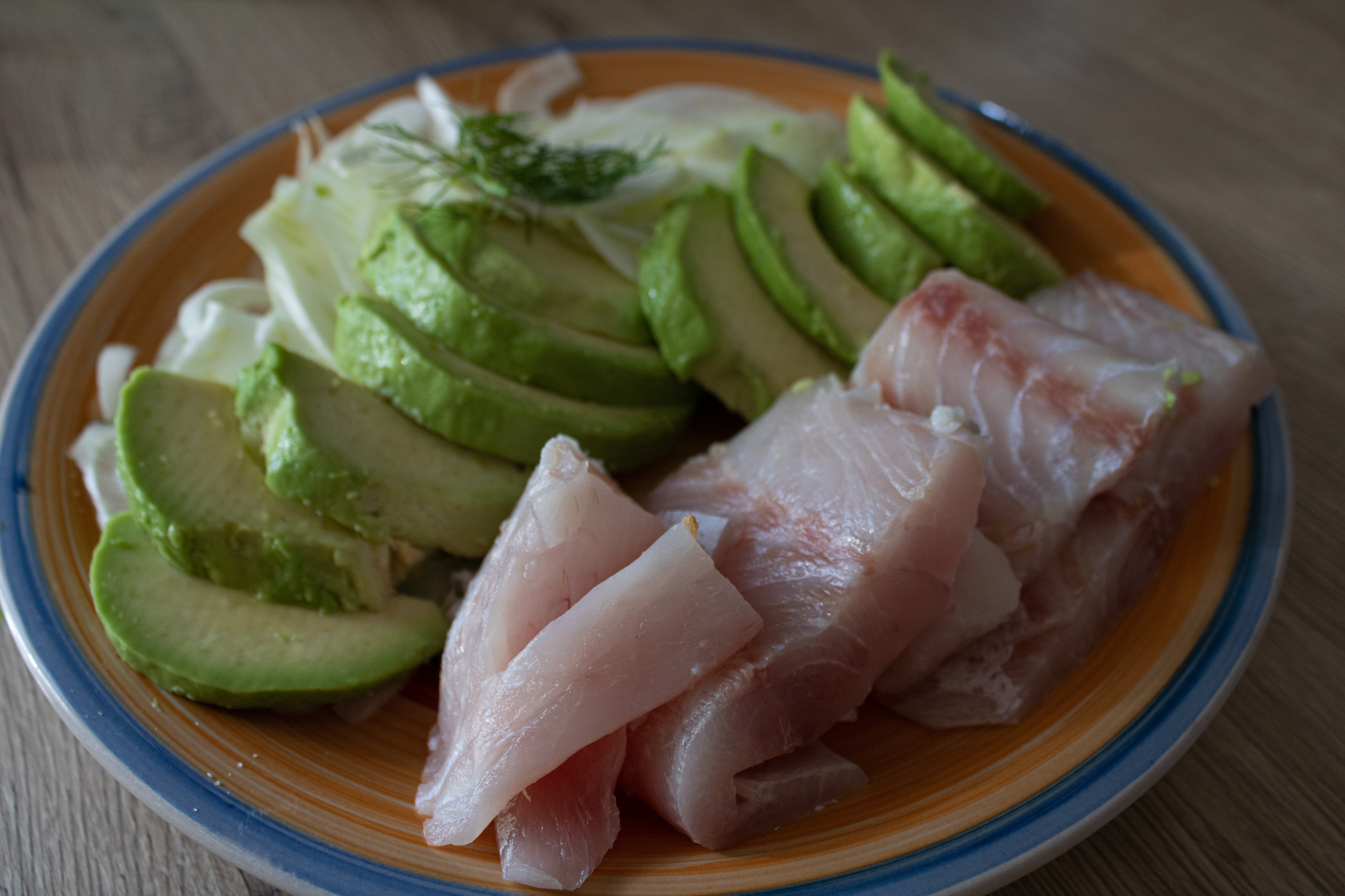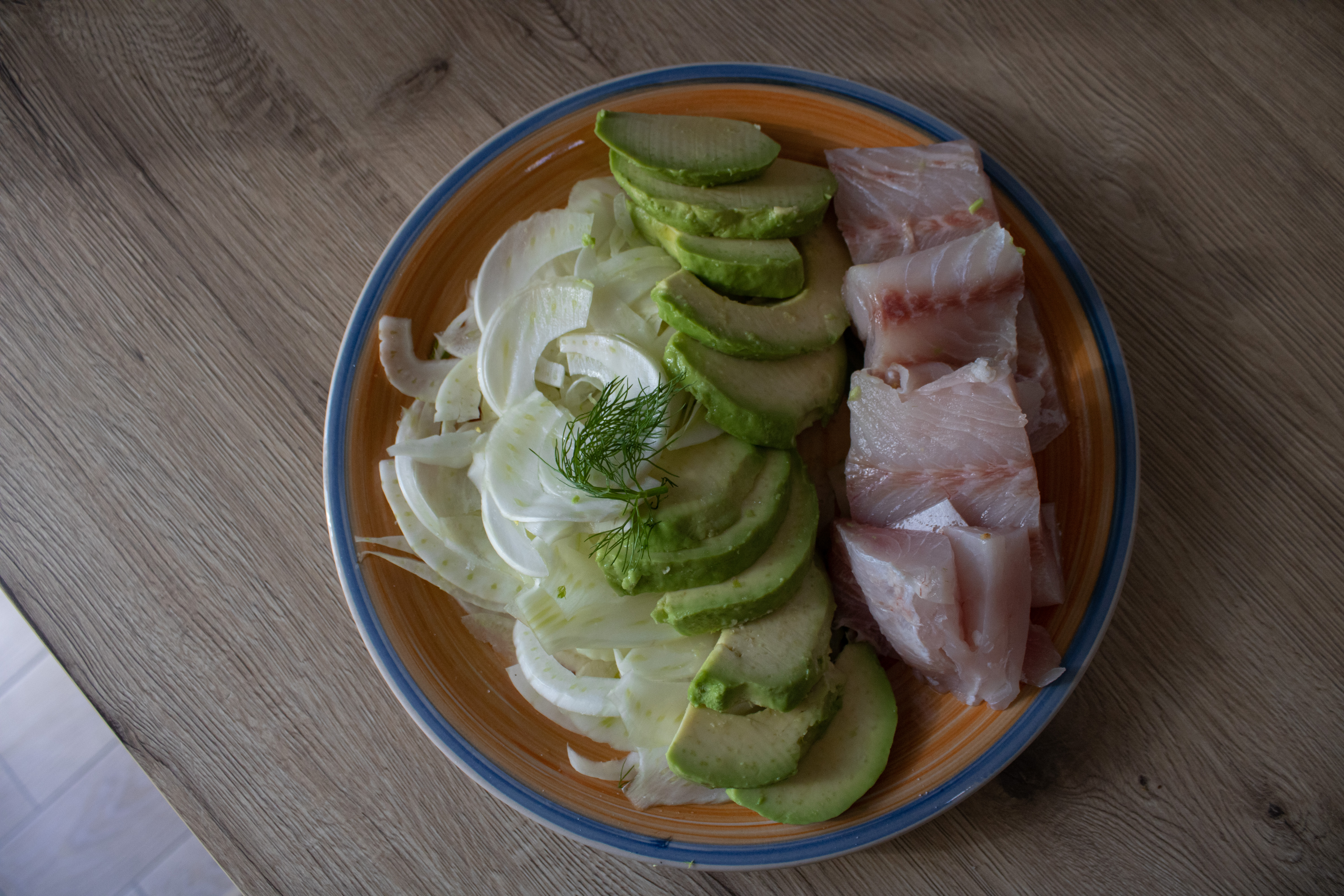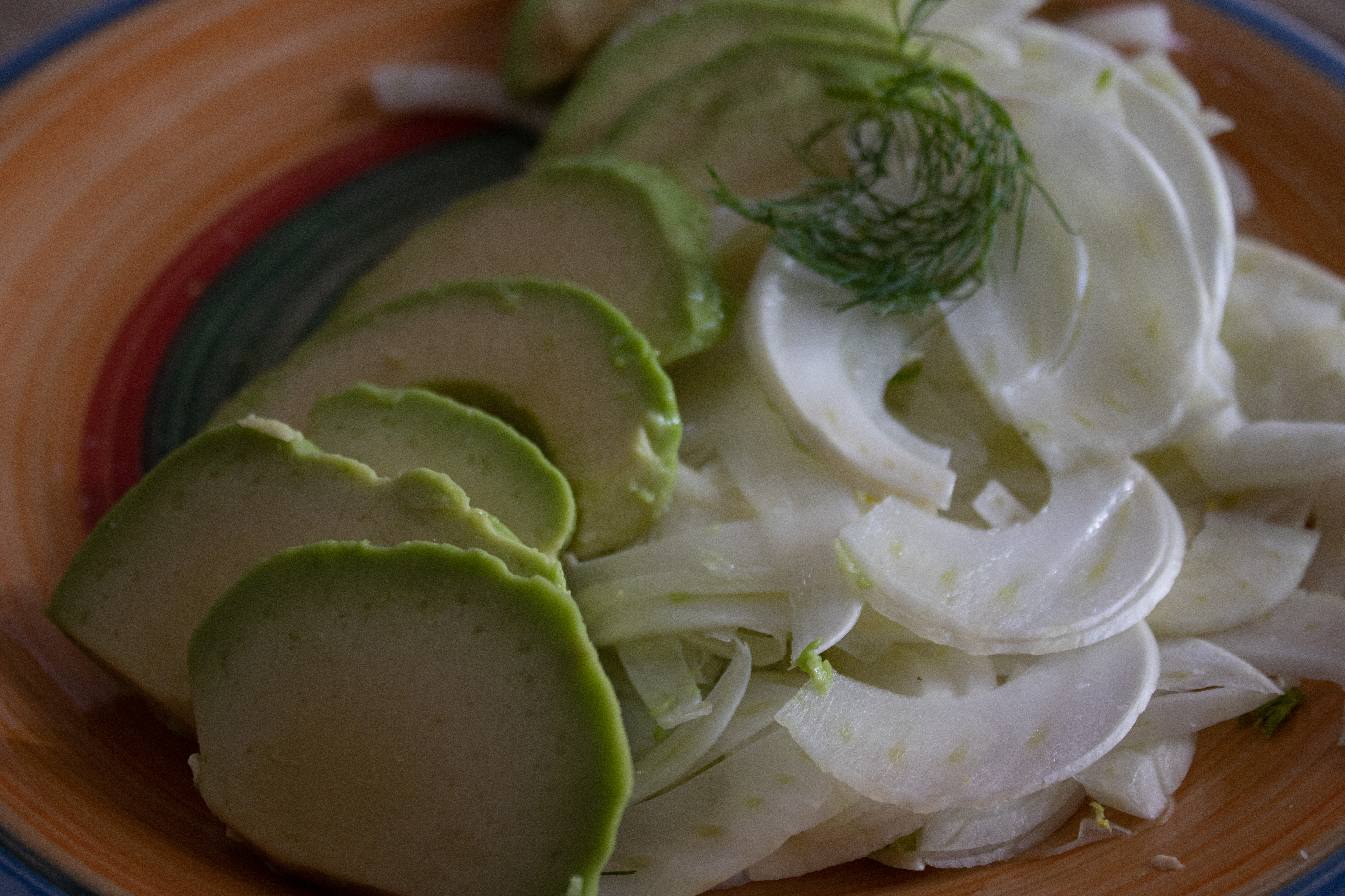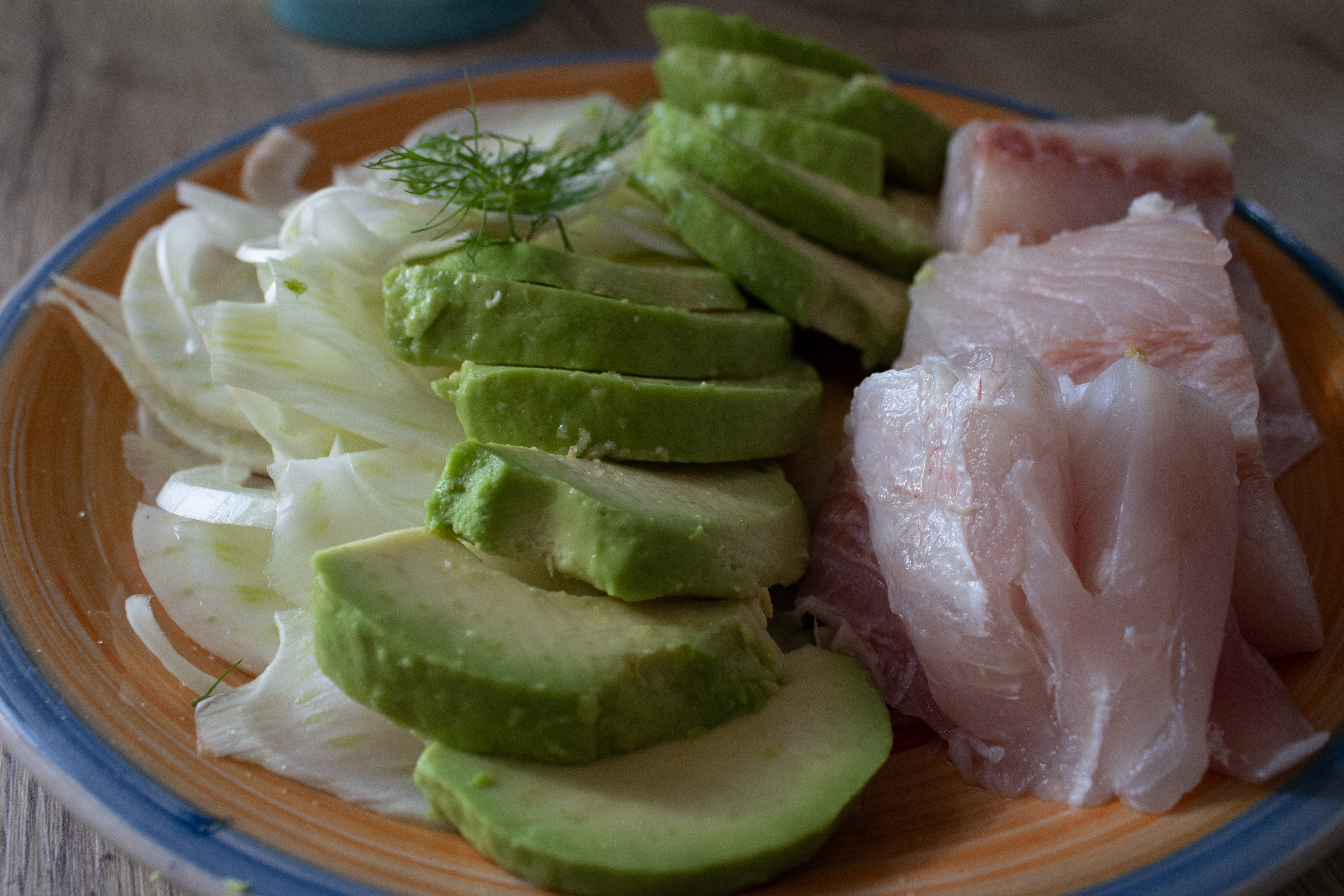 パーチ、アボカド、フェンネル、マンダリン コラティーナ品種 EVO オイルで味付けした、軽くておいしい料理です。