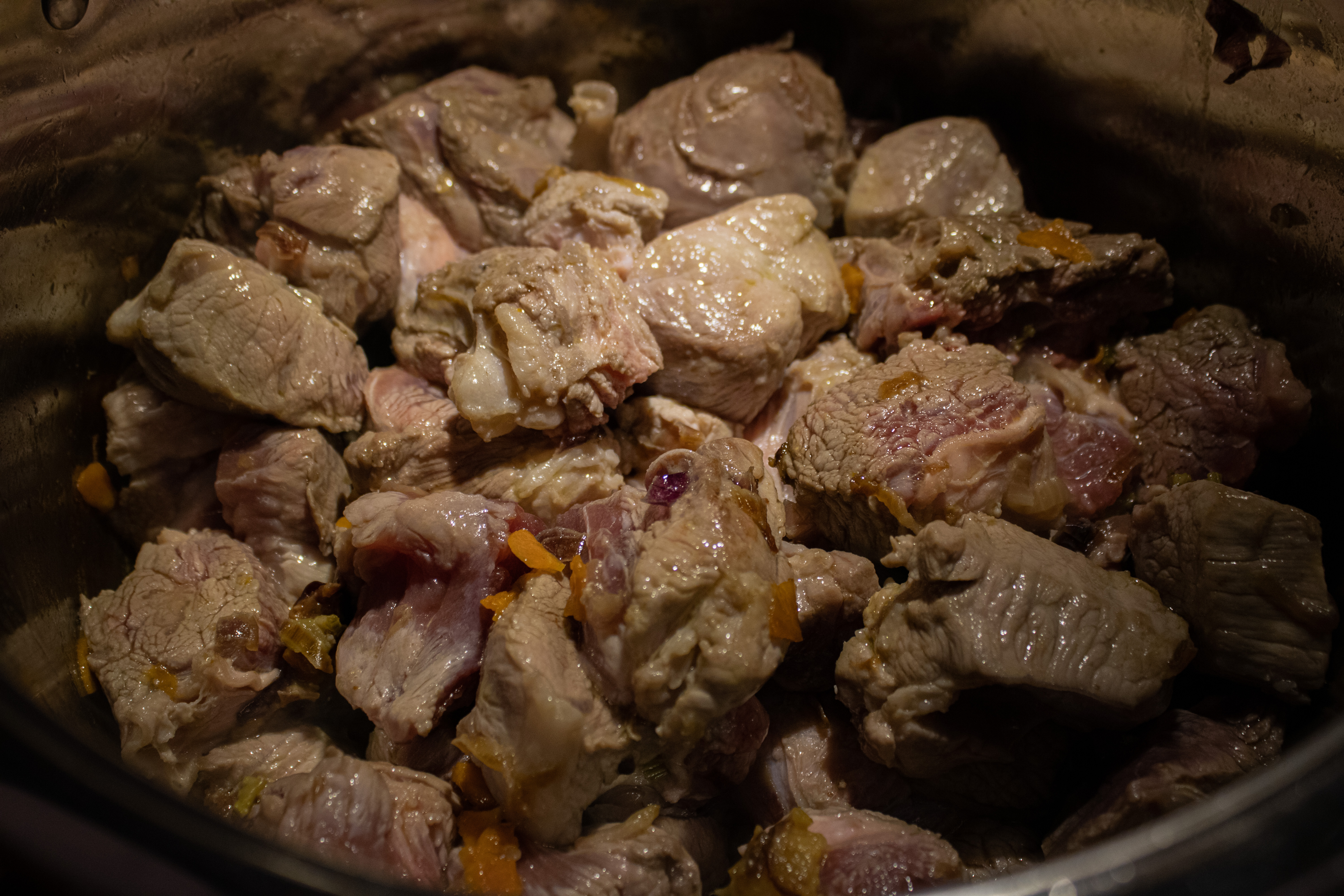 ニンジン、セロリ、タマネギを一センチぐらいの四角のに切り、背の高い鍋にエキストラバージン オリーブ オイル大さじ 2 杯を入れてよく炒めます。あらかじめ大きな四角に切った牛肉と豚肉を加え、強火で数分間焦げ目をつけます。白ワイン、月桂樹の葉、栗、プルーンを加えて混ぜ合わせ、熱を最小限に抑えます。コップ半分の水と塩を加えて味を調えます。蓋をして弱火で数時間、肉が柔らかくなるまで煮る。ローズマリー風味のエキストラバージン オリーブ オイル大さじ 2 杯を加えて調理を終了します。 少し冷ましてから、友達や家族に電話して一緒に楽しみましょう!
